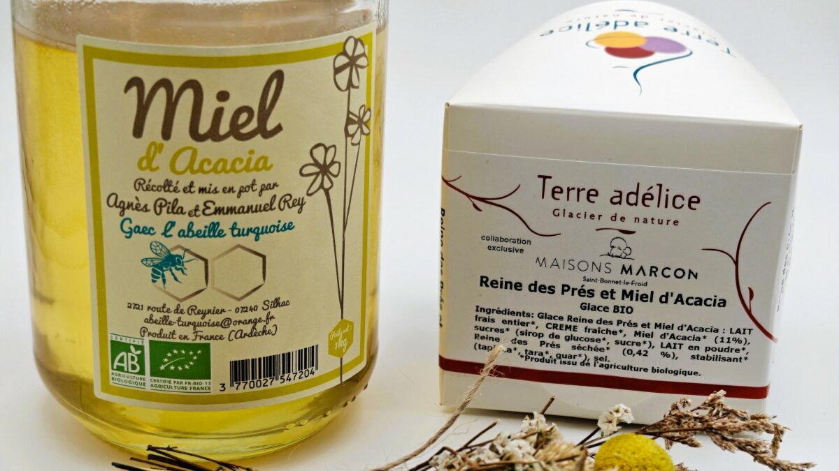 LAIT frais entier*, CRÈME fraîche*, miel d’acacia* (11%), sucres* (sucre*, sirop de glucose*), LAIT en poudre*, reine des prés séchée* (0.42%), stabilisant* (tapioca*, tara*, guar*), sel.